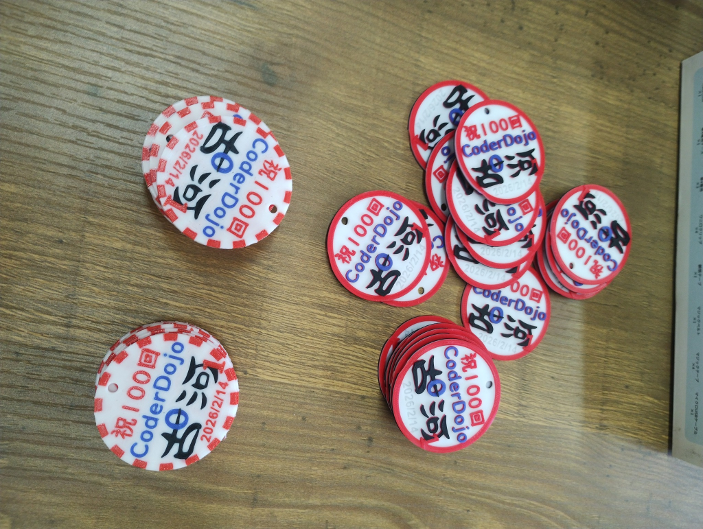 ・3Dプリンタで印刷した100回記念メダル。裏面はQRコードだよ